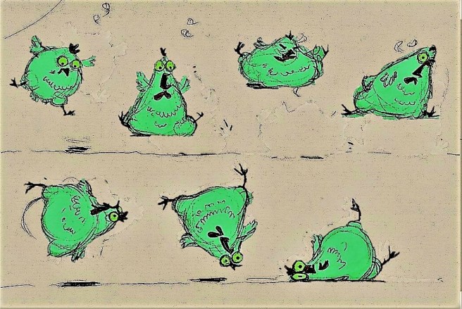 Gran susto me sacó abrir la puerta del aparato, ése que ni sonidos hacía, acostumbrada al otro tan ruidoso como un tractor. En una de las charolas y fuera de su cascarón se miraba un pollito y al lado, otro huevo estaba abriéndose, un líquido naranja brilloso goteaba sobre ellos, goteaba desde una cajita metálica que al principio pensé era parte del mismo refrigerador. Le dijimos a Cano y pronto vino por la caja; sabe en qué andaba metido ese hombre, a los días nos enteramos que lo habían hospitalizado por envenenamiento de radiación. Agarré los animalitos y los metí a la incubadora, tenían la piel toda azul, así sin plumas todavía, y aunque el refri enfriaba muy bien, los pollitos seguían calientes. Después de unas semanas, les salieron plumas verdes, como las de los pericos, pronto supe que eran hembras, al mes ya habían crecido al doble que las demás gallinas y ponían dos a tres huevos diarios.